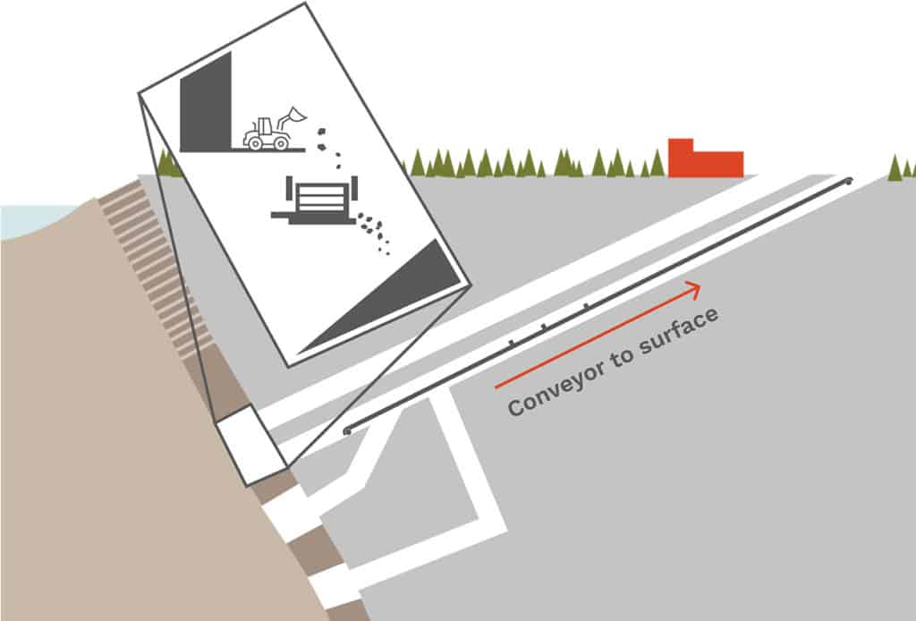 这种情况发生在被称为采场或房间的区域,这些区域通过钻孔和爆破打开。的含有矿物的矿石随后被压碎在地下,这将项目影响降到最低将噪音和灰尘深埋于地表之下。然后,第二个隧道中的传送带将破碎的矿石运送到加工厂。